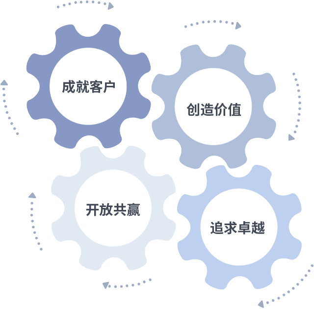 成就客户是一切决策的出发点,,,,创造价值是衡量所有工作的标准,,,,追求卓越是我们做事做人的态度,,开放共赢是我们的格局也是最终的结果。。。。价值观的齿轮环环相扣,,,,推动着组织里的每个人不断向前。。。。